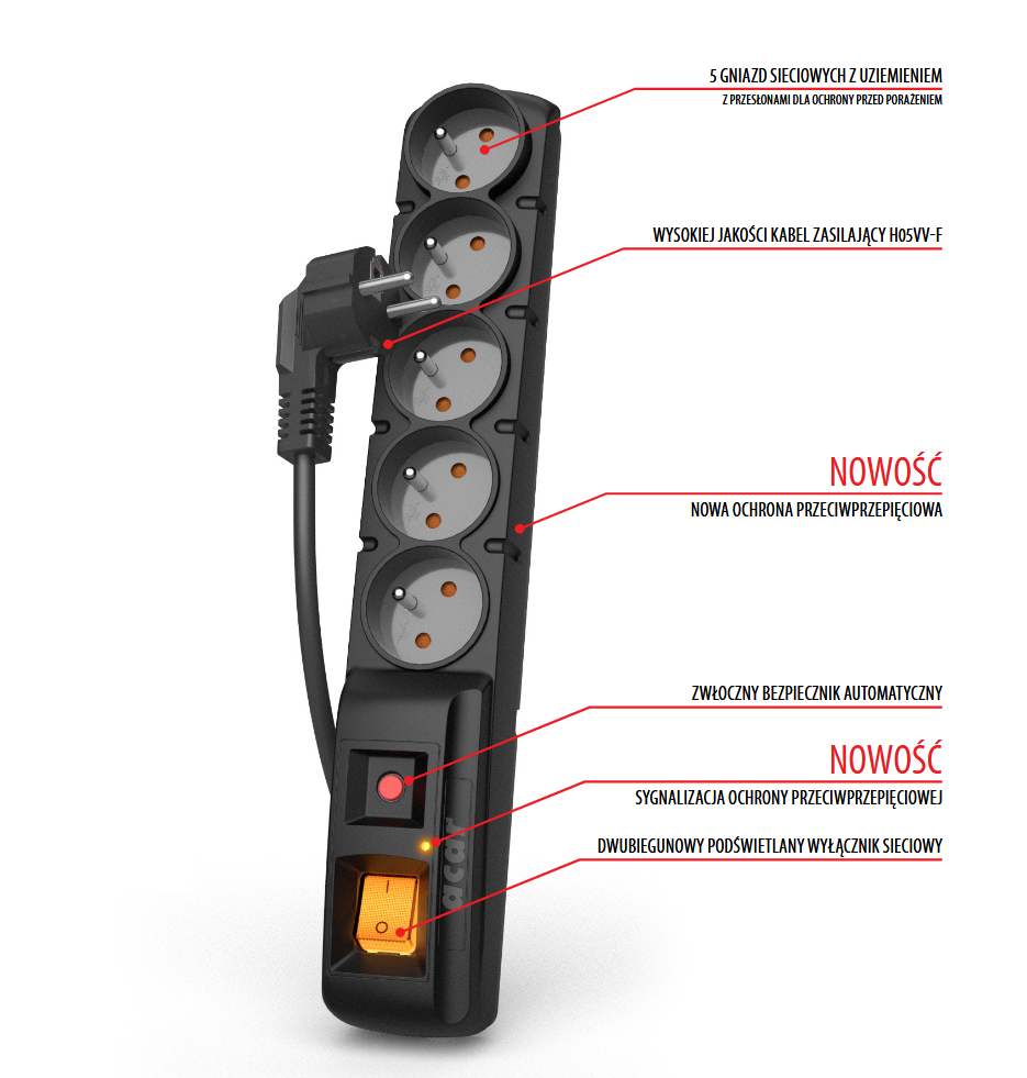Obudowa Acar F5 wykonana jest z wysokiej jakości, niepalnego tworzywa, a przesłony ochronne w gniazdach (Child Protection) zapobiegają przypadkowemu kontaktowi z elementami pod napięciem. Dłuższy, 3-metrowy kabel zasilający H05VV-F zapewnia większą swobodę rozmieszczenia urządzeń, umożliwiając wygodną instalację listwy w dowolnym miejscu pomieszczenia.