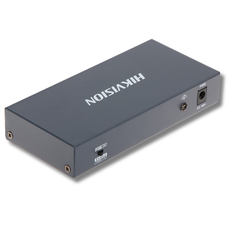 Switch Hikvision 6-portowy z 4 portami PoE/PoE+ i 2 uplink. Zapewnia stabilne zasilanie kamer IP, tryb Extend do 300 m oraz budżet PoE 38 W.